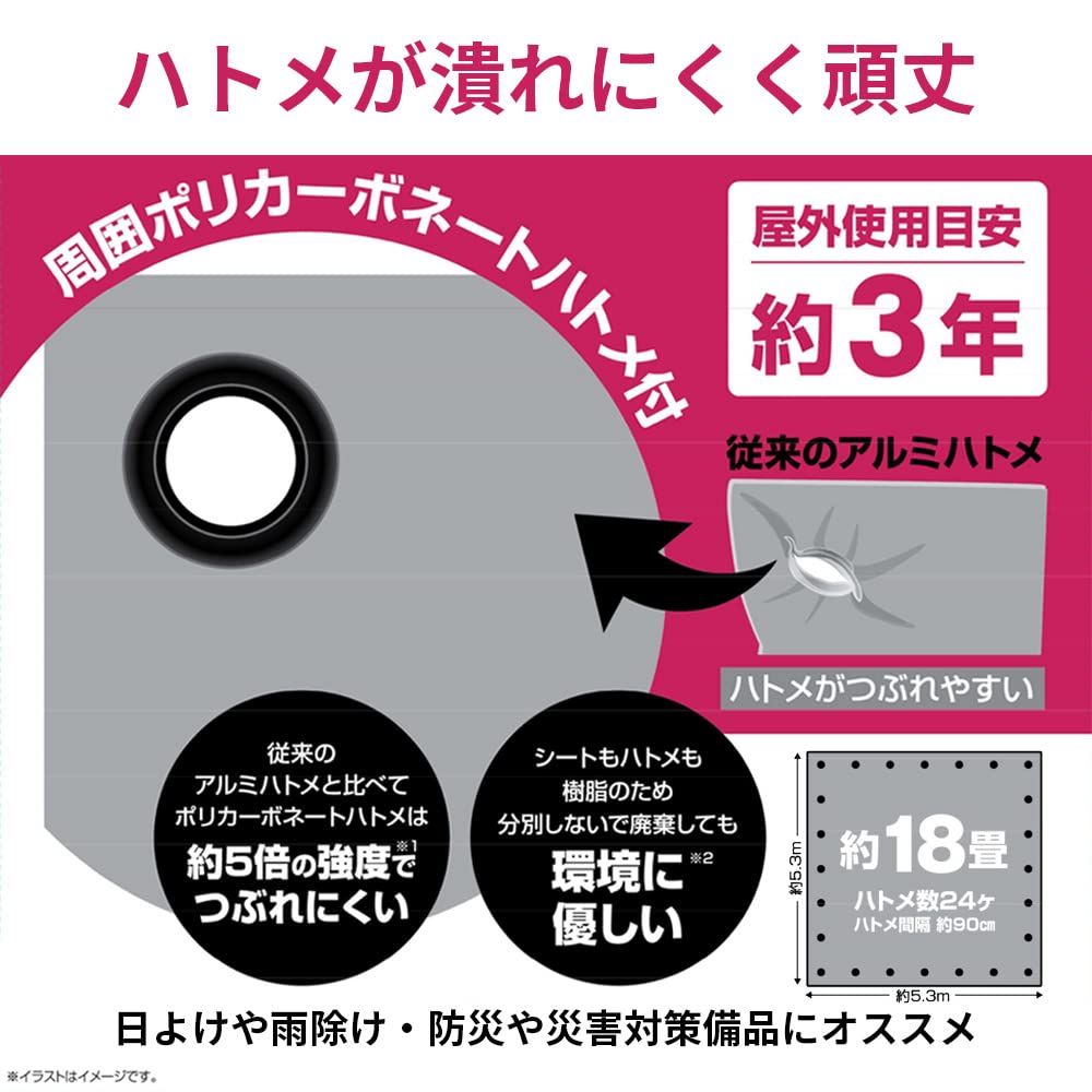 【特徴】超厚手タイプ(#4000)のイメージシートです。ポリカーボネートハトメ採用で従来のアルミハトメと比べ、約5倍の強度で潰れにくくなっています。シート素材もハトメ素材も樹脂のため分別せずに廃棄ができ、環境に優しい素材です。屋外使用目安は約3年と耐久性・対候性に優れています。養生などの作業だけではなく、日よけや雨よけ、プライバシー保護の目張りに加えて、防災や災害対策の備品としてもオススメです。