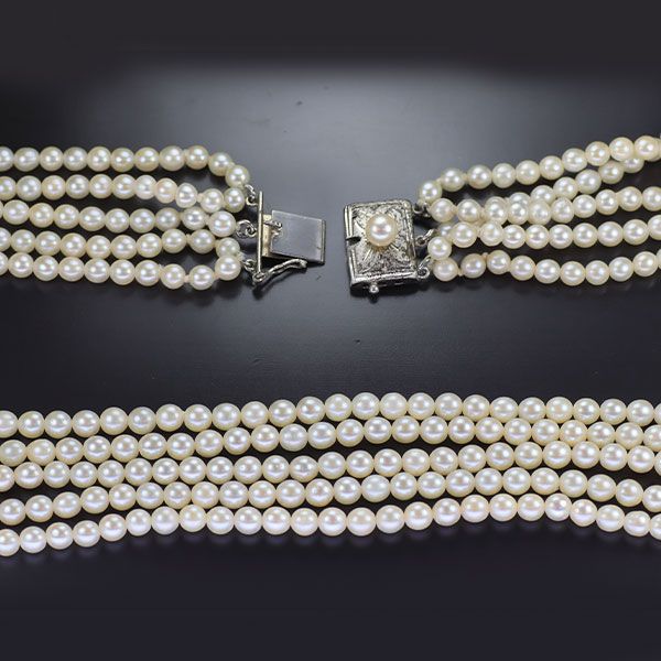 径約3.3-3.8mmのアコヤベビーパールをふんだんに使用した、シルバー素材のネックレスです。パールは、特有の地肌の荒れが僅かに確認できるピースもございますが、淡くピンク味を感じるテリのあるホワイトカラーのものがセレクトされています。一周に渡り5連にした豪華な一品。パーティシーンはもちろん、カジュアルスタイルにも装いの華やかなアクセントになってくれそうです。様々なコーディネートに合わせて幅広くお楽しみください。