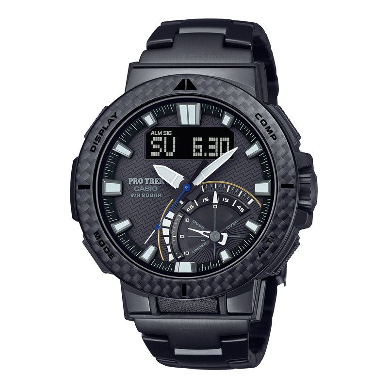 ●PRO TREKの20気圧防水を搭載したアングラーラインから、釣りのツールにインスパイアされたカーボンベゼル搭載のPRW-73です。