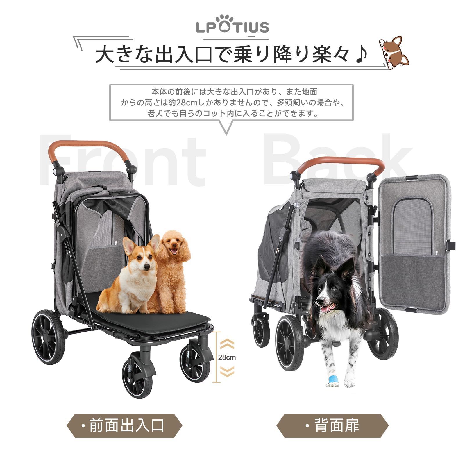 ドッグカート ワンタッチ 折りたたみ式 多頭用 耐荷重50 KG 扉付き 出入りラクラク 中型犬 ペットバギー 4輪 前輪360°回転 大型犬 後輪ブレーキ付き 犬用ベビーカー お出かけ ペットカート 散歩 通院 老犬介護用 LPOTIUS カート 組