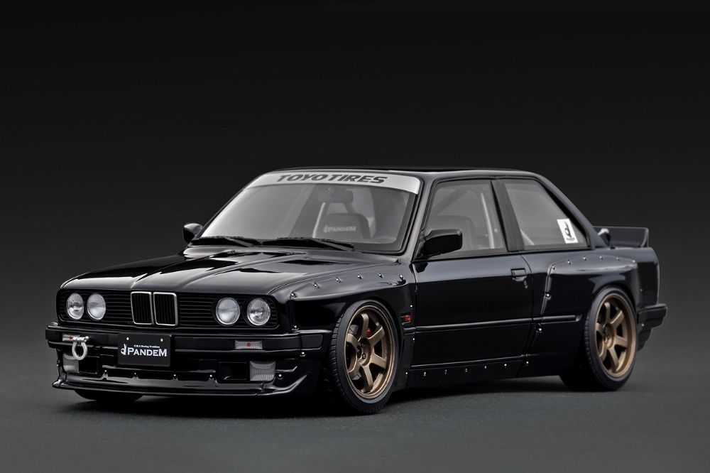 PANDEMのデモカー「30」を1/18スケールレジンモデルで再現。ボディカラー:ブラック。TE37タイプ 17インチホイール(ブロンズ)にローダウン仕様。専用ボディキット(フロントバンパー、前後ワイドフェンダー、リヤスポイラー)、フロントウィンドウ上部にスポンサーマーク、クォーターウインドウに「PANDEM」ロゴ、レッドキャリパー、フロントバンパーに牽引フック、PANDEM製バケットシート、ナルディタイプステアリング、ロールケージ、シングルマフラーを装着。