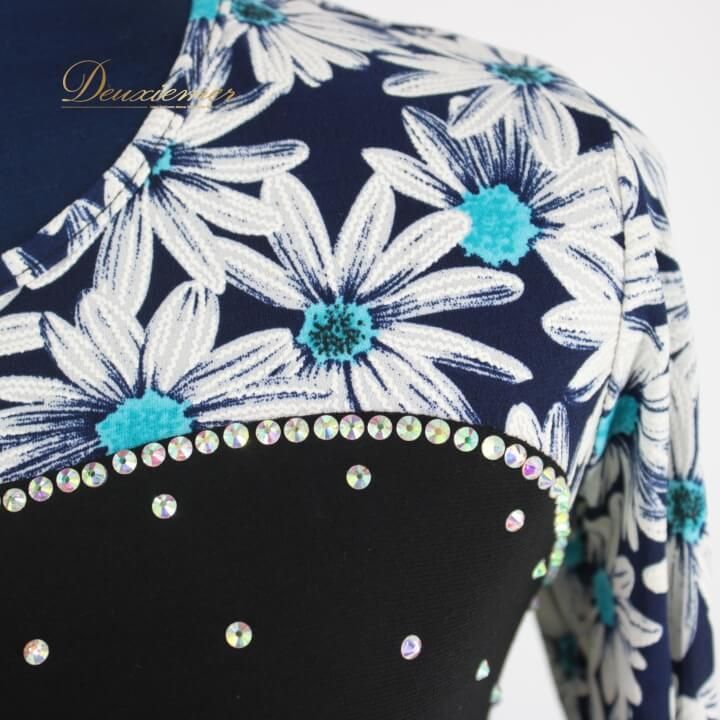 社交ダンス 衣装 ツーピース セットアップ レッスンウェア レディース オールシーズン GRANT 白 黒 ブラック系 ホワイト系 花柄 ブルー系 水色 青 ラインストーン 長袖 花柄デザイン ゴムウエスト 伸縮性あり Mサイズ