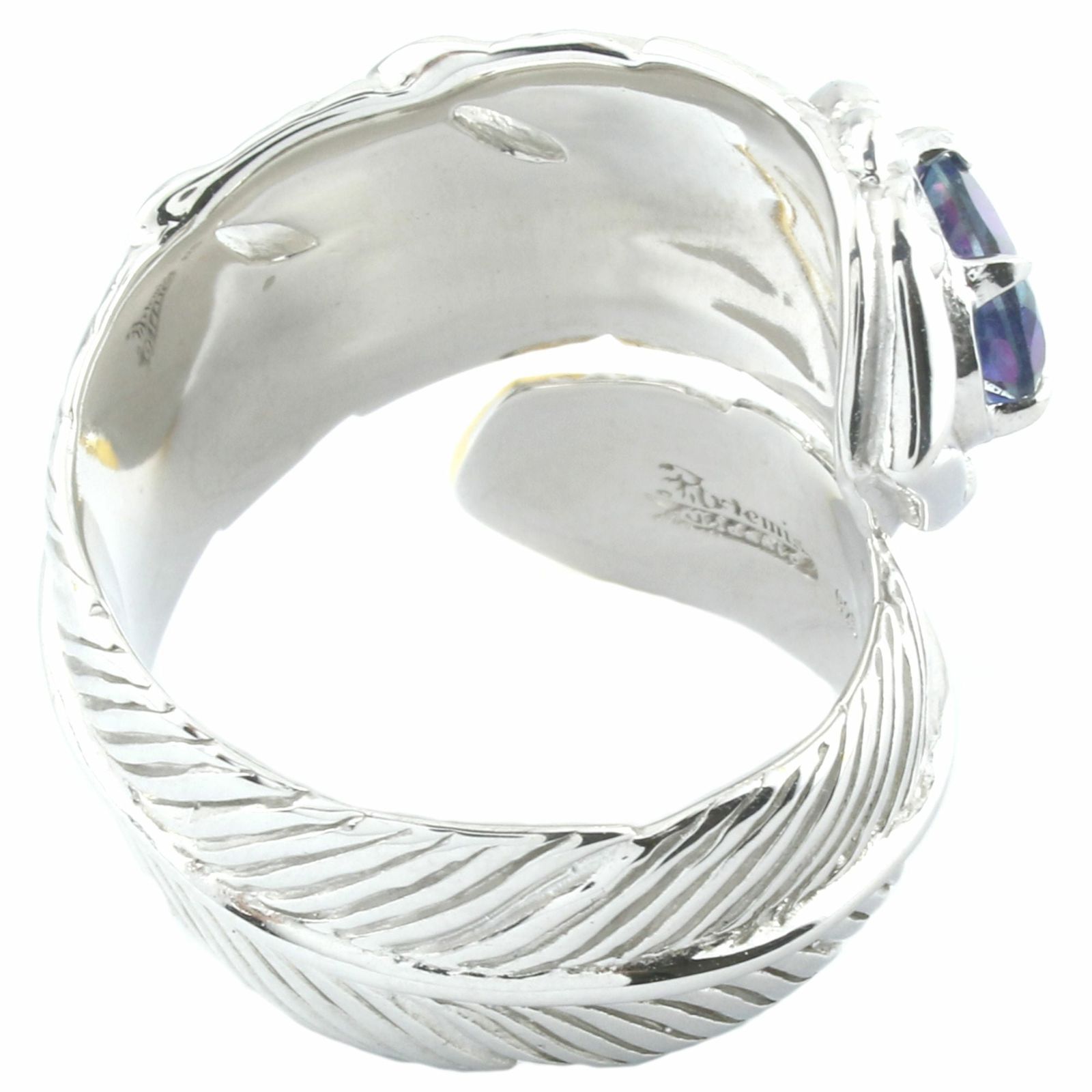 An Artemis-style feather ring crafted around a wing motif. Fine engraved lines trace the fluid silhouette of the feather, with a gold-plated tip adding rhythm and dimension. The stone setting is adorned with classical arabesque details, cradling a mystic topaz whose aurora-like brilliance shifts with the light—blue, violet, and green tones emerging from different angles. Long a symbol of “ascent” and “breakthrough,” the wing is reinterpreted here with modern sensibility: a design that balances strength and elegance, becoming a true art piece to wear. The interplay of the scintillating mystic topaz, the crisp gleam of sterling silver, and the gold accent creates a ring with unmistakable presence.