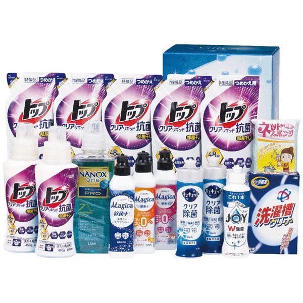 ●毎日の必需品をセットしました。●箱サイズ:23.7×19.3×27.4cm●現品サイズ・内容:450gライオントップクリアリキッド抗菌・220ml花王キュキュット(クリア除菌)各2本・600gライオンNANOXonePRO・220mlライオンCHARMYMagica除菌プラス・220mlライオンCHARMYMagica酵素プラス(オレンジの香り・フレッシュピーチの香り)・170mlP&G除菌ジョイコンパクト各1本・350gライオントップクリアリキッド抗菌(詰替用)5個・洗濯槽クリーナー(5錠入)・ネットスポンジ各1個・[日本製]・スポンジ[中国製]●重さ:5374g●製造生産地:日本製●メーカー型番:KOJ-150B※画像はイメージです。シリーズで画像を共用している場合があります。※閲覧環境により実際の色味や質感と異なって表示される場合がございます。※部品・パーツなどの一部の商品では本体の商品画像を使用しております。※製品の仕様・画像・パッケージは、メーカー側から予告なく変更される場合があります。