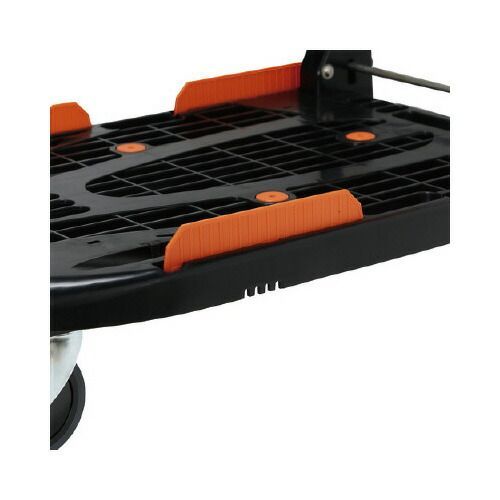 ●種別/折りたたみ式●カラー/ブラック●耐荷重/200kg●寸法/長さ780×幅490×高さ162mm●キャスター寸法/直径100×幅28mm●材質/デッキ:再生ポリプロピレン(PP)再生材100%、ハンドル:アルミ、キャスター金具:スチール、車輪:エラストマー樹脂●質量/6.8kg●仕様/回転式の荷物落下防止柵を標準採用。荷物の転落を防止します。省音キャスター採用とメッシュ構造採用により床面からの反響音が減少し走行音が静かです。●機能/前輪のみ自在式