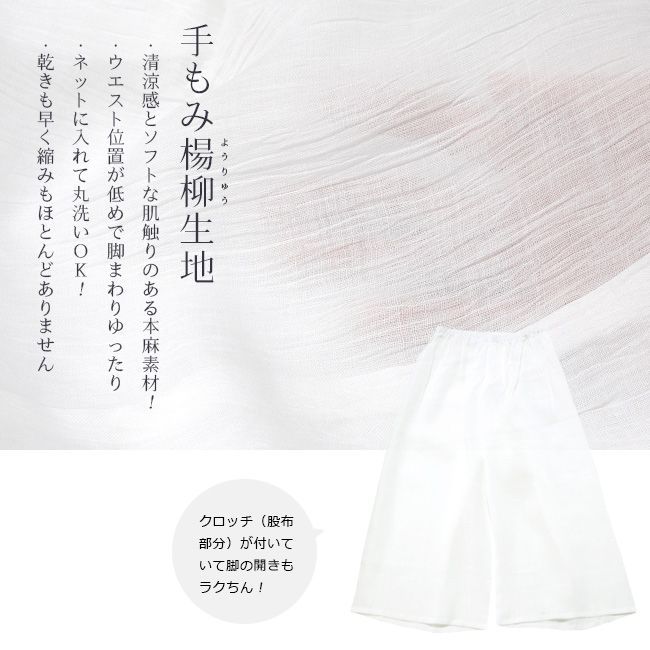 涼しい夏の裾よけステテコ 本麻 手もみ楊柳 M寸 着物 和装肌着 女性用 白 パンツ裾除け ステテコ〔Mサイズ〕